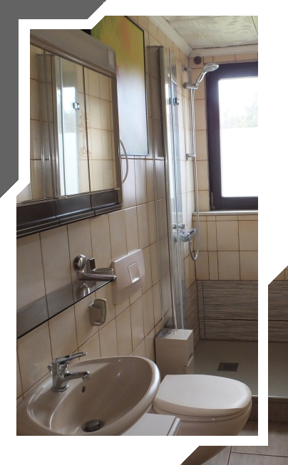 Das Bad der Ferienwohnung ist klein, aber fein. Mit Waschbecken, darüber einem Spiegelschrank, WC und Dusche ist es komplett ausgestattet.