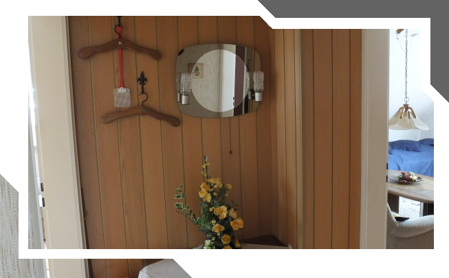 Der Blick zum Eingang mit der neuen Wohnungseingangstür. Diesmal links die Eingänge für Küche und Bad (Falttür), rechts der Zugang zum Schlafzimmer.