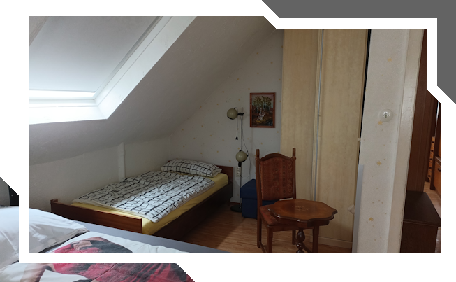 Neben dem Doppelbett steht als weitere Schlafgelegenheit ein Einzelbett, ebenfalls mit guter Federkernmatratze, zur Verfügung. Es ist ein Klappbett, könnte tagsüber auch hochgeklappt werden.
