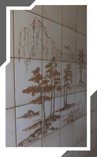 Und auf der gegenüberliegenden Wand lockert ein Motiv die Fliesenwand optisch auf.