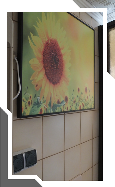 Infrarotheizungen arbeiten vergleichbar zur Sonne. Was lag da naher, als die Heizung mit einem schönen Sonnenblumenbild zu "verstecken"?