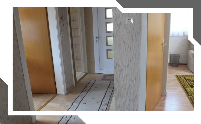 Der Blick zum Eingang mit der neuen Wohnungseingangstür. Diesmal links die Eingänge für Küche und Bad, rechts der Zugang zum Schlafzimmer.
