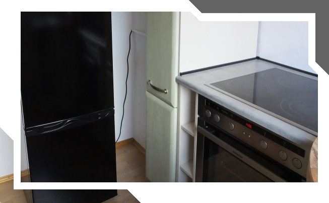 Ein großer Kühlschrank mit separater Tür für das Gefrierfach bietet ausreichend Platz, um Lebensmittel für den Ferienaufenthalt gut zu lagern. Und der Apothekerschrank für Gewürze etc.