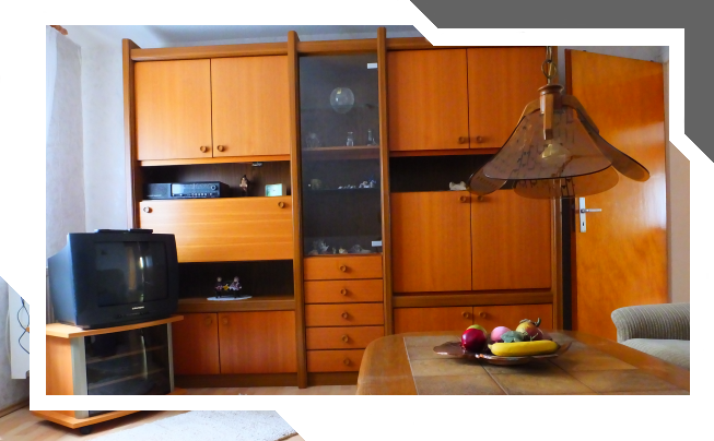 Die Wohnwand bzw. der Wohnzimmerschrank enthält Ausstattung für die Ferienwohnung, bietet aber auch den Gästen Platz für das Unterbringen von Kleidung oder anderen Gegenständen.